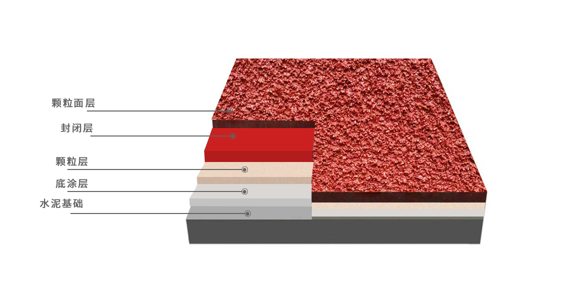 介于渗水型和混合型跑道之间,弹力层采用EPDM彩色颗粒摊铺,弹性好成本低,中间用环保的双组份聚氨酯混合料刮图封闭加固,耐磨性能好。